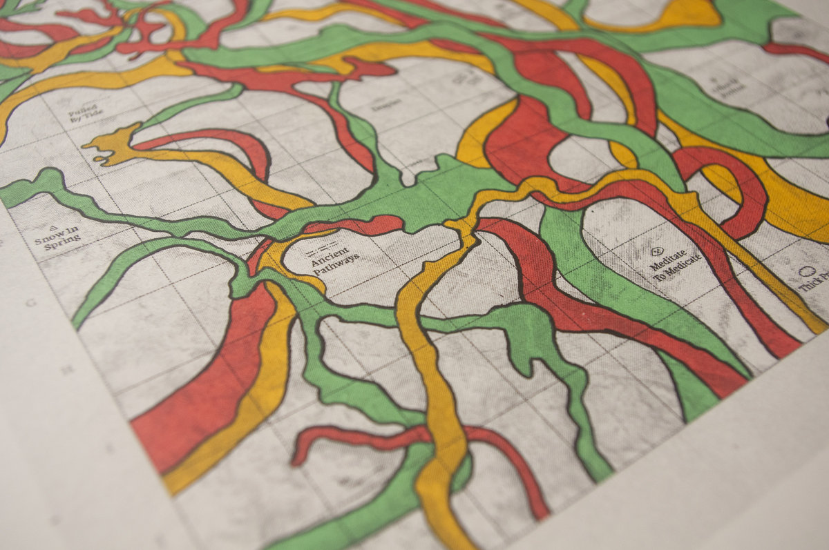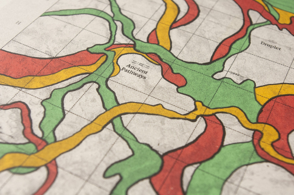 Norwegian artist and designer, Ole Ødegaard, created an original piece of artwork inspired by old river maps. These show the swell and ebb of rivers as colourful swaths across topographical illustrations. Ole created an imaginary map of the Norfolk broads (an area well known to Luke) and created his own river map over the top using bright bands of interweaving colours, not dissimilar to the tangled web created by patch cords on a modular synth.